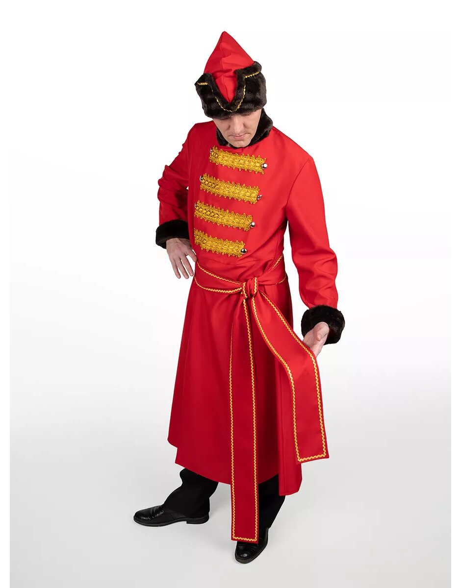 The carnival costume of the marksman will help create the image of a brave young man from Russian folk tales. We have thought through all the details to ensure that the Russian folk costume looks authentic. The set includes: a kaftan, a hat, and a belt. According to tradition, the marksman's costume consists of a red kaftan with a stand-up collar and a cone-shaped hat with fur trim. The chest fastenings are adorned with gold-colored cords, making the outfit ceremonial. The costume is made of gabardine fabric (high-quality dense polyester).