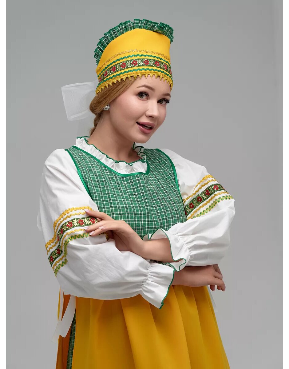 The green and yellow colors have always been filled with special meaning for Slavs; they were associated with spring, the sun, and the awakening of life. We have created this stunning Russian folk costume specifically for Russian folk holidays and Slavic festivals.The folk costume can be used for photo shooting, for stage performances, and as a gift for enthusiasts of Slavic traditions. The set includes: a white shirt with embroidered ribbons, a green skirt, a two-side apron with the embroidered ribbon at the bottom. The ensemble is complemented by a headpiece matching the outfit, tied with white ribbons. The wonderfully beautiful Russian folk clothing will make you the most noticeable at your Slavic festival!