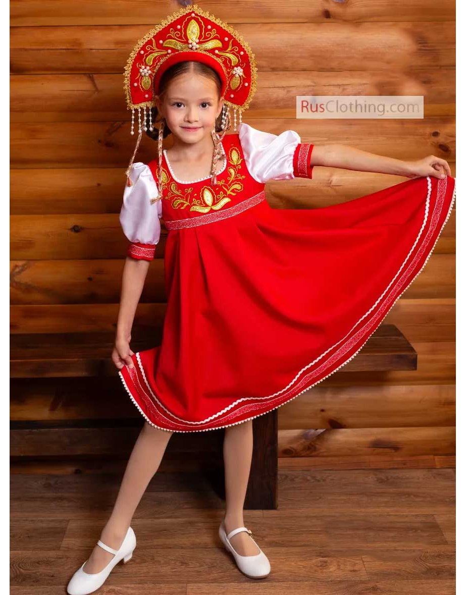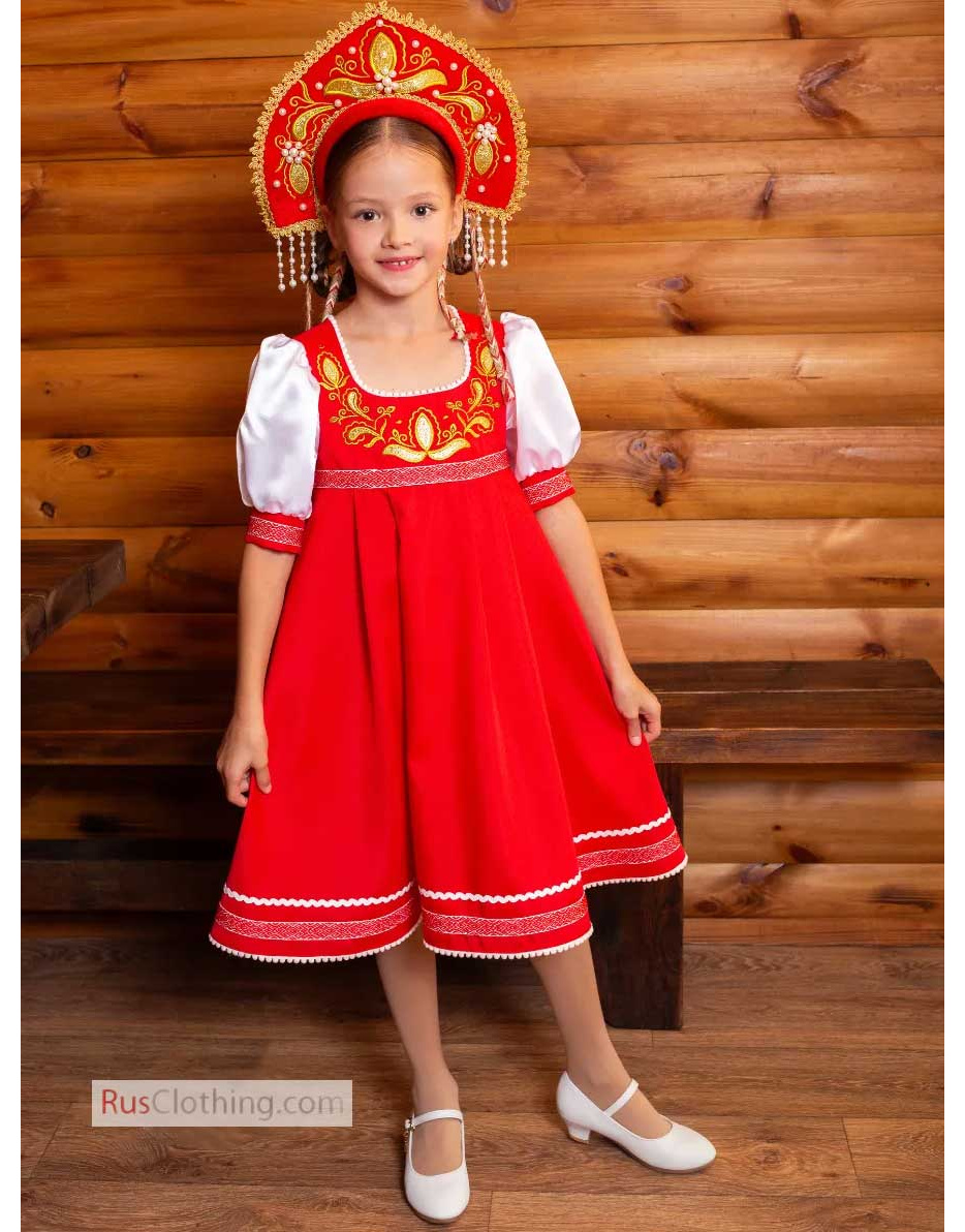 The Russian costume consists of a white blouse and a circle sarafan. The costume goes perfect for Russian dancing thanks a knee length and a circle skirt. Such Russian dresses can be designed for specific sizes as well per individual request.