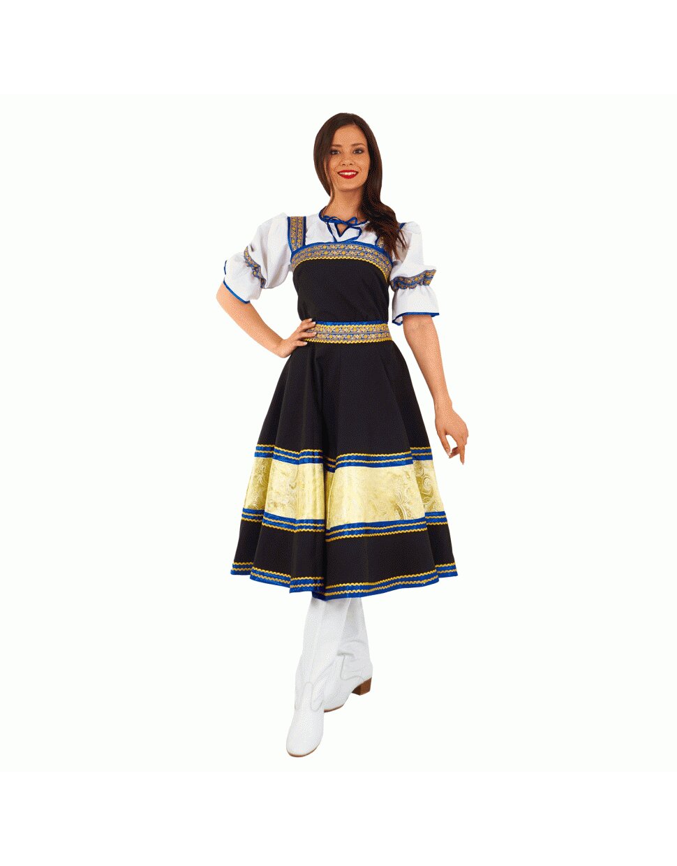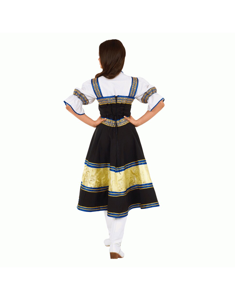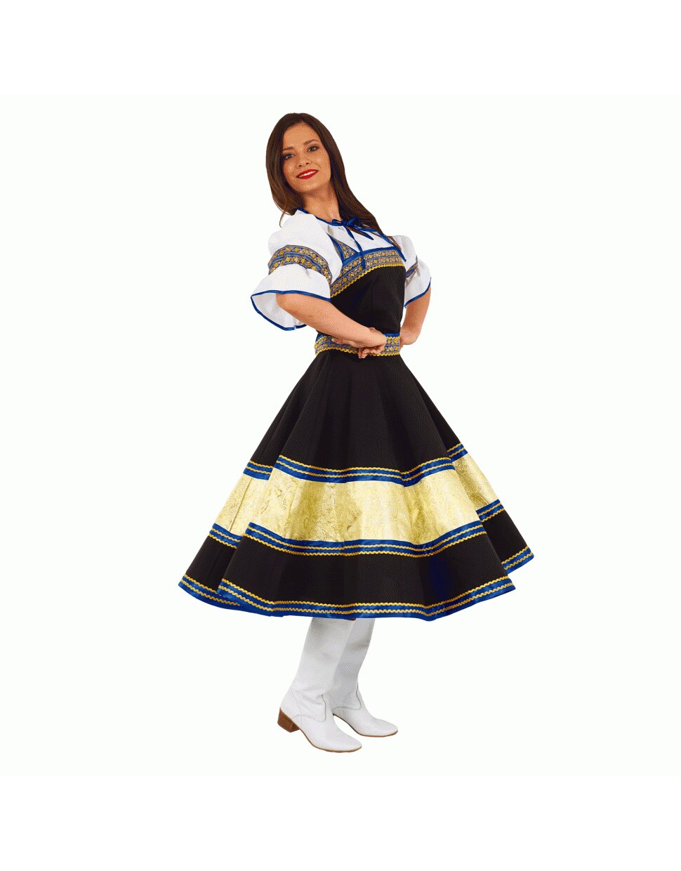 This Russian fancy dress looks stylish and perfect on every lady! The combination black with golden is aesthetically remarkable. Gold is associated with power, vigor, and fire, and black - with - earth's force. The Russian clothing costume consists of a white blouse with ornamental sarafan dress. Such Russian folk dresses are the hits in our collection for dance groups and individually made.