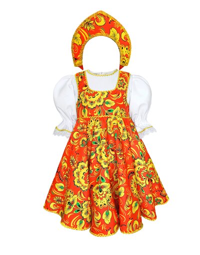 The Russian dance costume consists of a white blouse, headpiece and a circle sarafan. The costume goes perfect for Russian dancing thanks to a short, knee length and an expressive circle skirt. These stylized Russian folk dresses can be designed for small girls, bigger sizes as well per individual request.