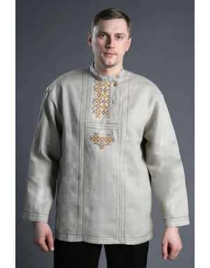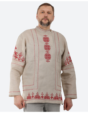 Kosovorotka or rubakha is a traditional Russian shirt, which has long sleeves and has a length up to mid-thigh. The kosovorotka shirt may have some button only on the collar, and is usually quite closed to protect the body from any damages or insects. Traditionally kosovorotka was worn by peasants, but then a lot of tradesmen liked this type of shirt as well. Tolstovka name of the shirt comes from Russian writer Leo Tolstoy who customarily wore one. This true rubakha style - Russian shirt is made of high quality Russian linen and highlighted with traditional handmade embroidery on the chest.