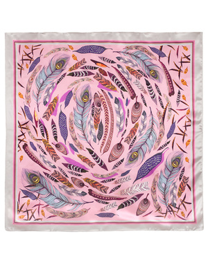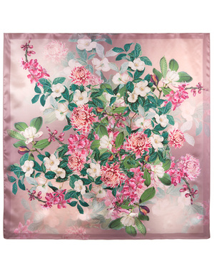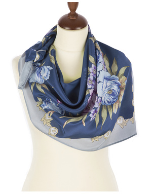 Russian silk headscarves keep Pavlovo Posad traditions. Main pattern element is a rose, minor flowers in the centre, closer to the edges flowers become bigger and wind by oriental ornaments, also known as "Turkish cucumbers", as the shawl tradition came to Russia from East. The painter can make flowers tremble, palpitate from wind breath or freeze with the first snow.
