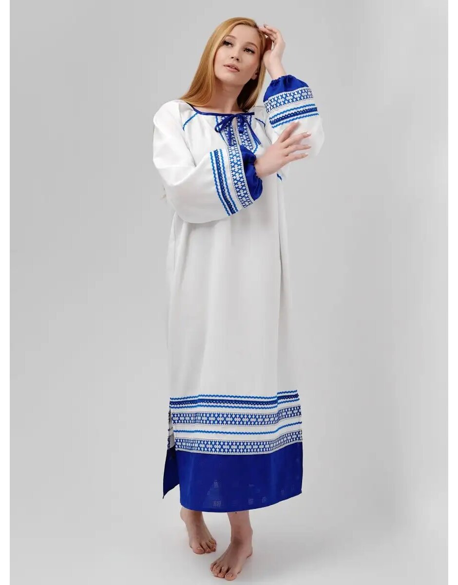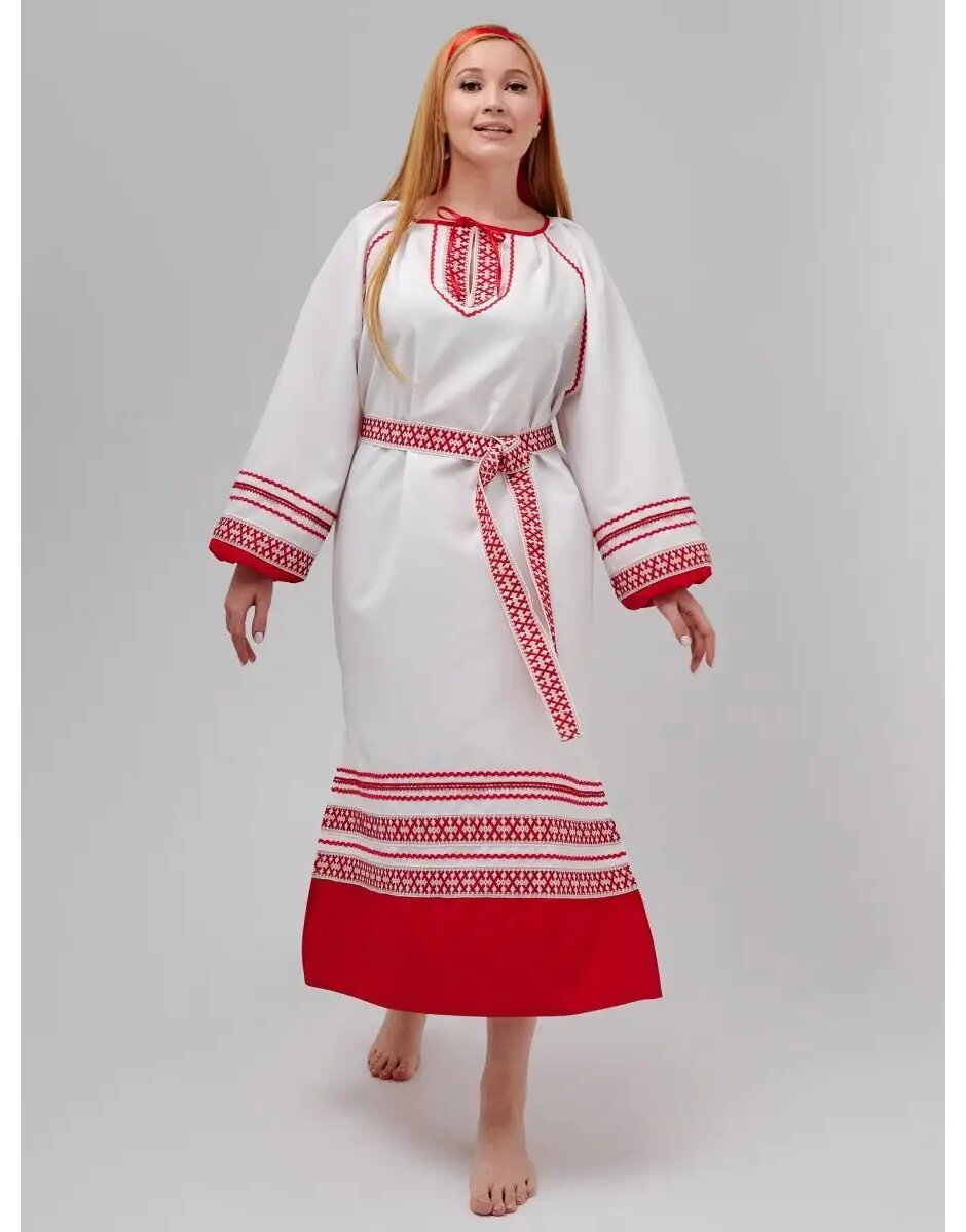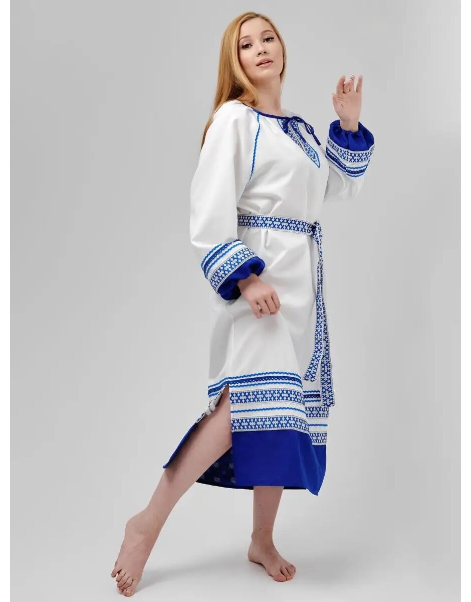 Le costume folklorique russe, la "rubakha" de style slave, est un attribut essentiel des festivités populaires lors des fêtes folkloriques traditionnelles telles que le jour d'Ilyin, le jour de Perun, le jour d'Ivan Kupala, la Maslenitsa et autres festivals slaves. Ces chemises étaient spécialement cousues pour être portées le premier jour de la fenaison. Les robes de style folklorique slave sont présentées dans la catégorie des costumes de carnaval. Une caractéristique distinctive de la robe de fête pour les festivals slaves est la broderie sur l'ourlet et les manches. La "rubakha" est ornée de ruban tressé avec des motifs. Le tissu principal est en gabardine blanche. Le bas de la chemise est fait de gabardine rouge / bleue contrastante, ressemblant à de la dentelle. La robe se noue au niveau de l'encolure. La chemise ample de style tunique ne restreint pas les mouvements et est excellente pour les performances et les danses. Pour les ensembles de danse, nous proposons des costumes folkloriques russes en deux couleurs - rouge et bleu. Les costumes folkloriques à thème slave peuvent être utilisés pour des productions théâtrales, des représentations lors d'événements scolaires, des festivités de groupe et des événements slaves thématiques.